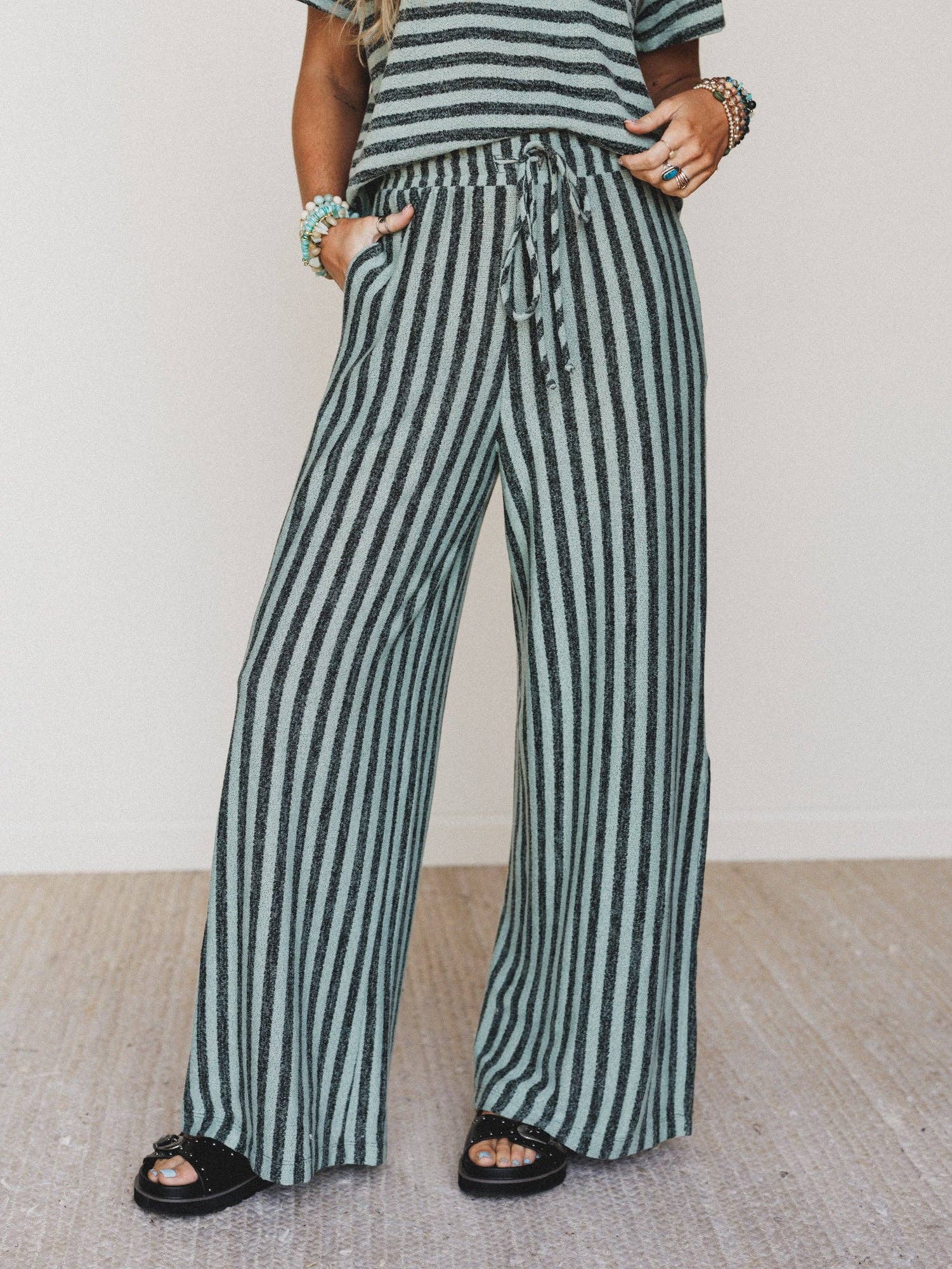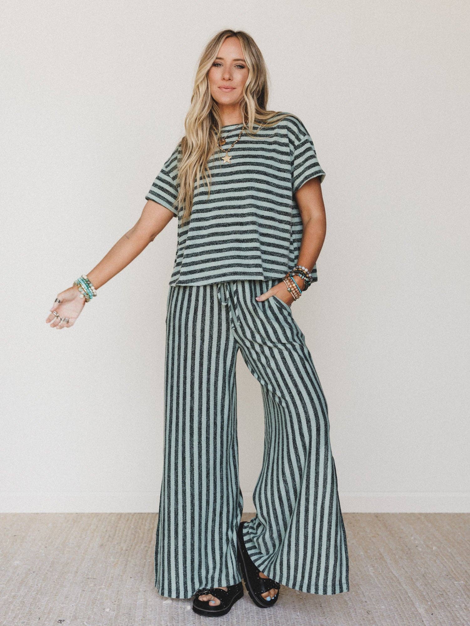 Designed for relaxed days and effortless coordination, these striped pants bring an easy, coastal feel whether you’re lounging, traveling, or heading out styled as a set. * Soft, lightweight fabric with an easy drape and breathable feel * Comfortable drawstring waist for an adjustable, relaxed fit * Wide-leg silhouette with vertical stripe pattern for a flattering look * Side pockets for everyday functionality * Pairs perfectly with the matching The Nest Ibiza Breeze Striped Top for an easy outfit win Model is 5'8″ and wearing a size Small.